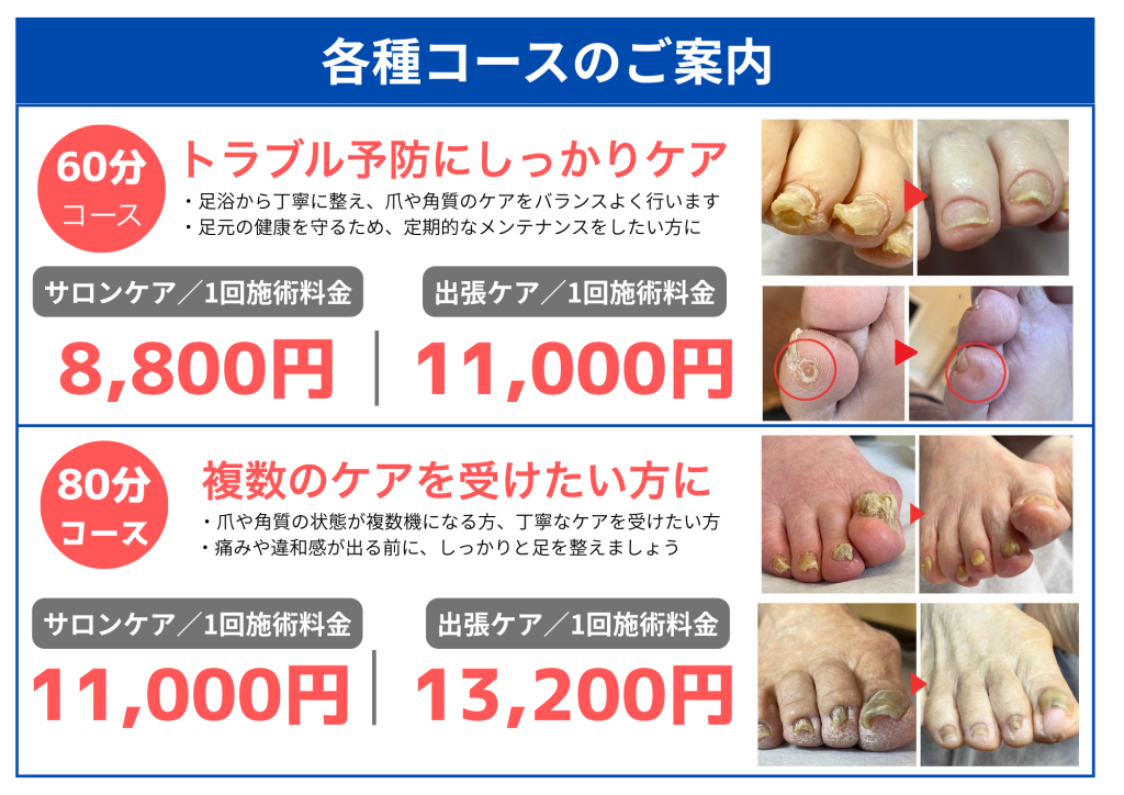目安として、爪ケアの場合約4週間、タコ・魚の目の場合3週〜4週間、そのあと再びトラブルになる前にケアをおすすめしております。